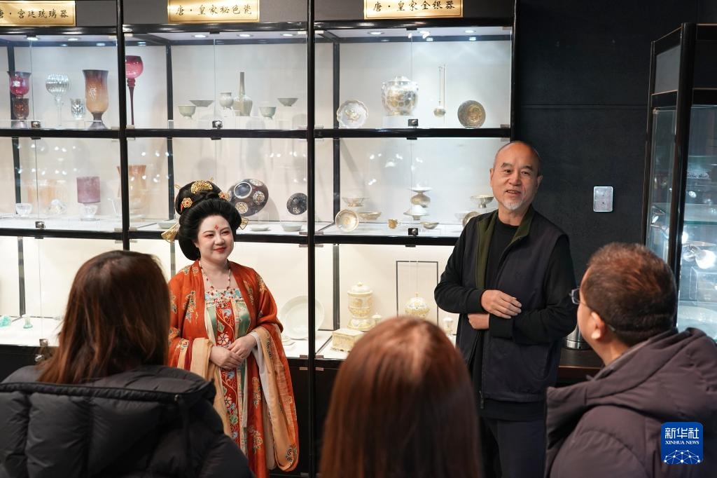 1月9日,李欢(正面左)与法门寺博物馆特邀研究员、中国国际茶文化研究会学术委员王苗(正面右)一起为游客讲解唐代茶具的种类和故事。