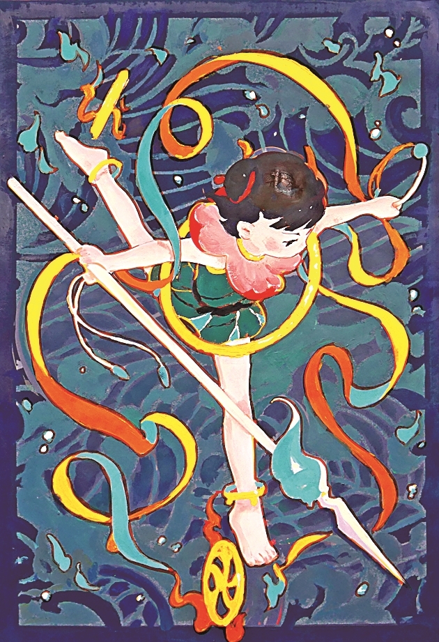 装饰艺术不仅存在于平面,也服务于立体空间,在环境设计、建筑设计、工业设计等领域均有广泛应用。因此,在进行设计实践之前,对于空间感的培养尤为重要。在“空间与构图”教学板块中,如何将图案、叙事或观念融入平面或立体空间,拓展装饰艺术的维度,进行综合性的设计表达,是训练的主要目标。为了突破课堂教学的局限性,我们精心设置了极具趣味性和参与感的环节。如在讲授克孜尔石窟、莫高窟等古代石窟的装饰艺术时,我们会组织学生来到一间空旷的教室,在墙上悬挂高清打印的壁画复原图,并将室内光源全部隔绝,让同学们分批次进入教室,仅借助手电筒的光线进行局部观看。这样的训练方式,是为了尽可能模拟石窟内的场景,让学生摒弃一览全局的便捷,学会沉下心研读每一处线条、每一组纹样的排布巧思,身临其境地感受壁画、造像上的图案或纹样从平面空间到立体空间的转化,逐步建立起由点到面、由局部到整体的感知能力。