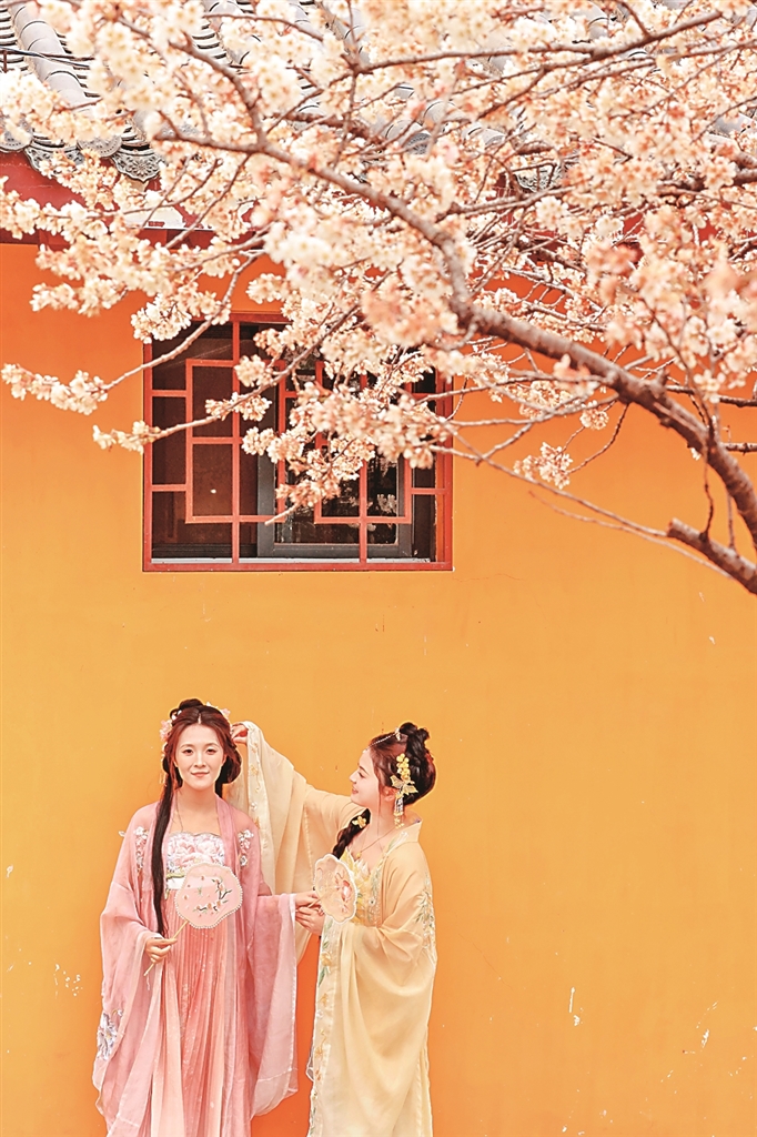 游人身着汉服在湖北省武汉市龙华寺景区赏花拍照。新华社发
